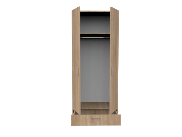 Dulapul este dotat cu rafturi, 1 zona de umerase si 1 sertar si este realizat din PAL de 18mm grosime si manere metalice solide.