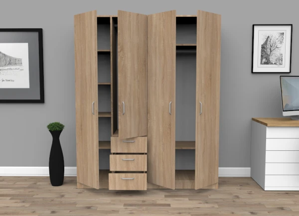 Dulapul este dotat cu rafturi, 2 zone de umerase si 3 sertare si este realizat din PAL de 18mm grosime si manere metalice solide.